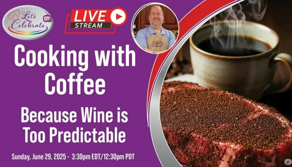 Sunday, June 29, 2025 – 3:30 pm Eastern US EDT – In this highly questionable but fully caffeinated livestream, we’re tossing out the wine and cooking dinner with coffee instead. Espresso rubs, cold brew marinades, mocha sauces—nothing is off the table (except common sense). Will it taste incredible? Will we sleep tonight? Will we regret this immediately? Yes, no, and probably. Join us live for a full meal made with beans, boldness, and a complete disregard for culinary norms.